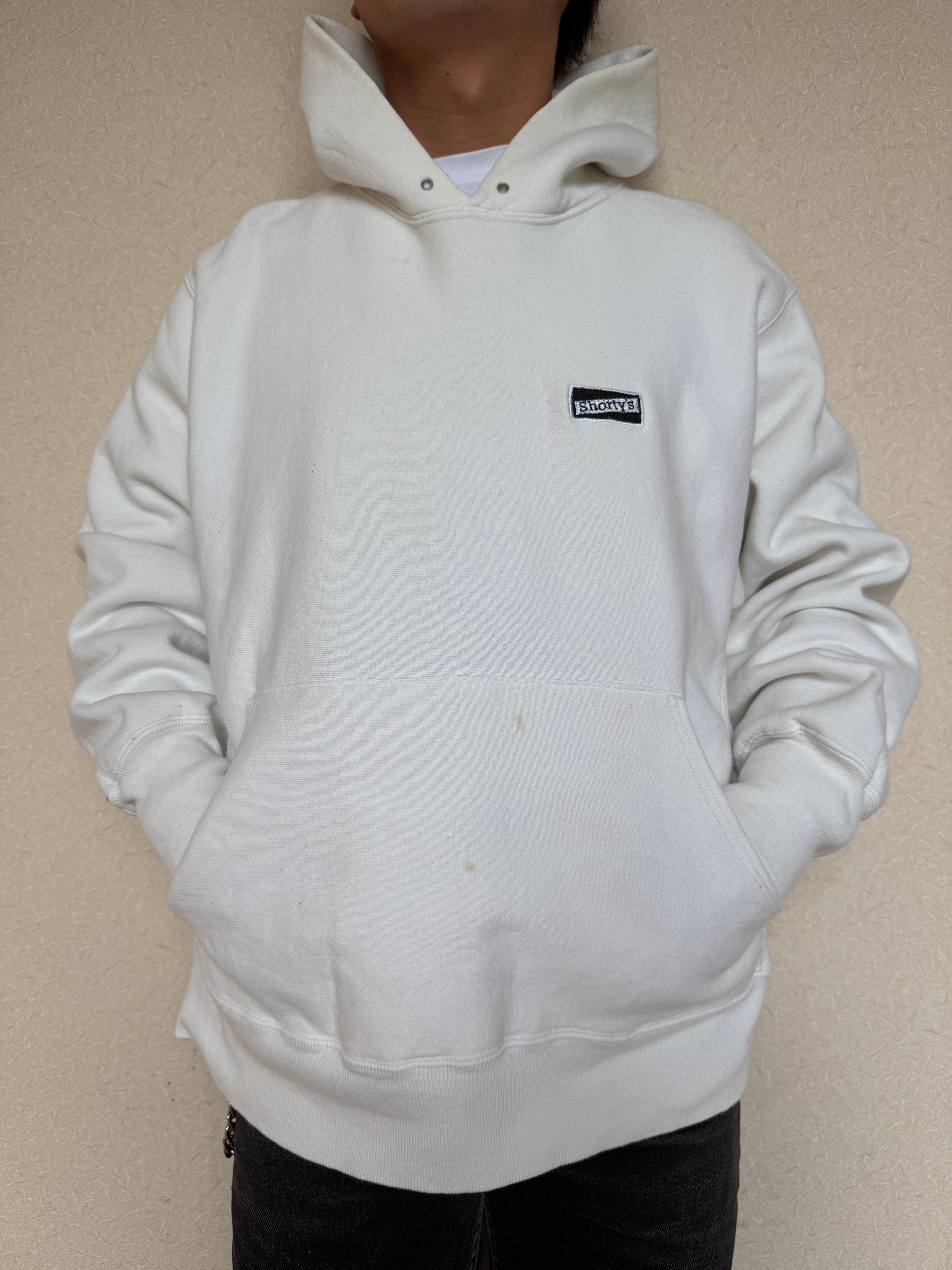 白のパーカーはネルシャツやウールシャツのインナーにもとても使えます!