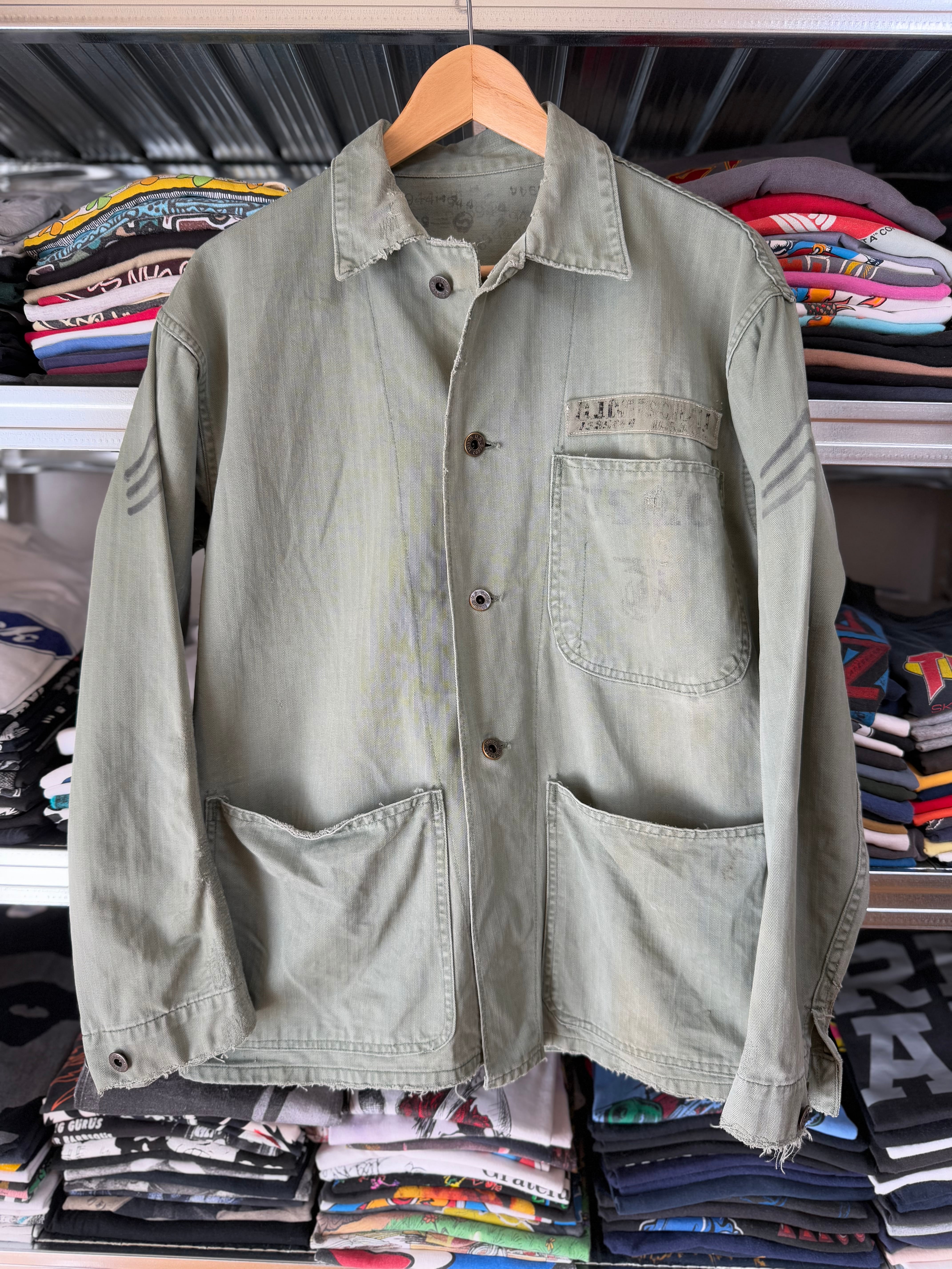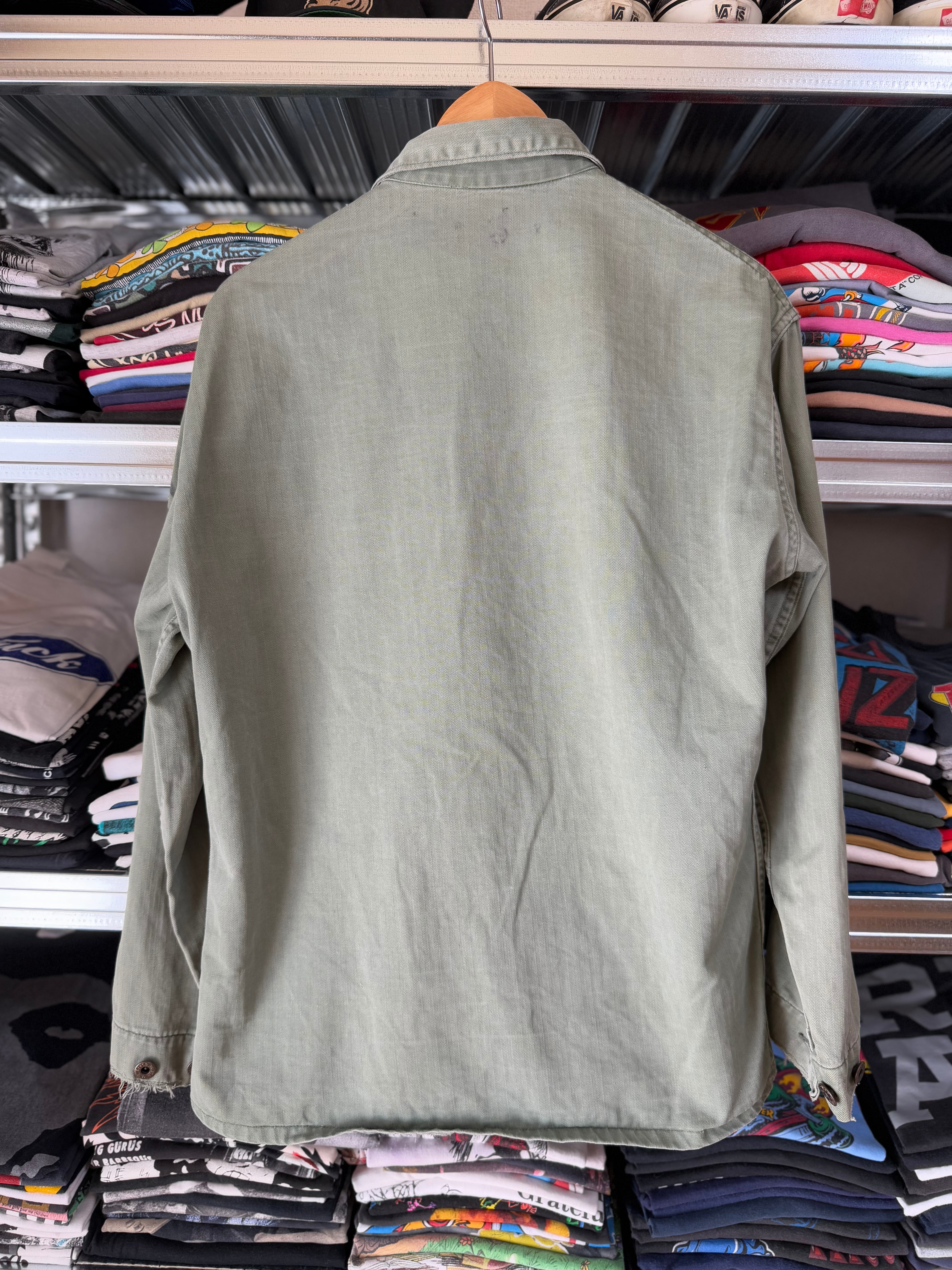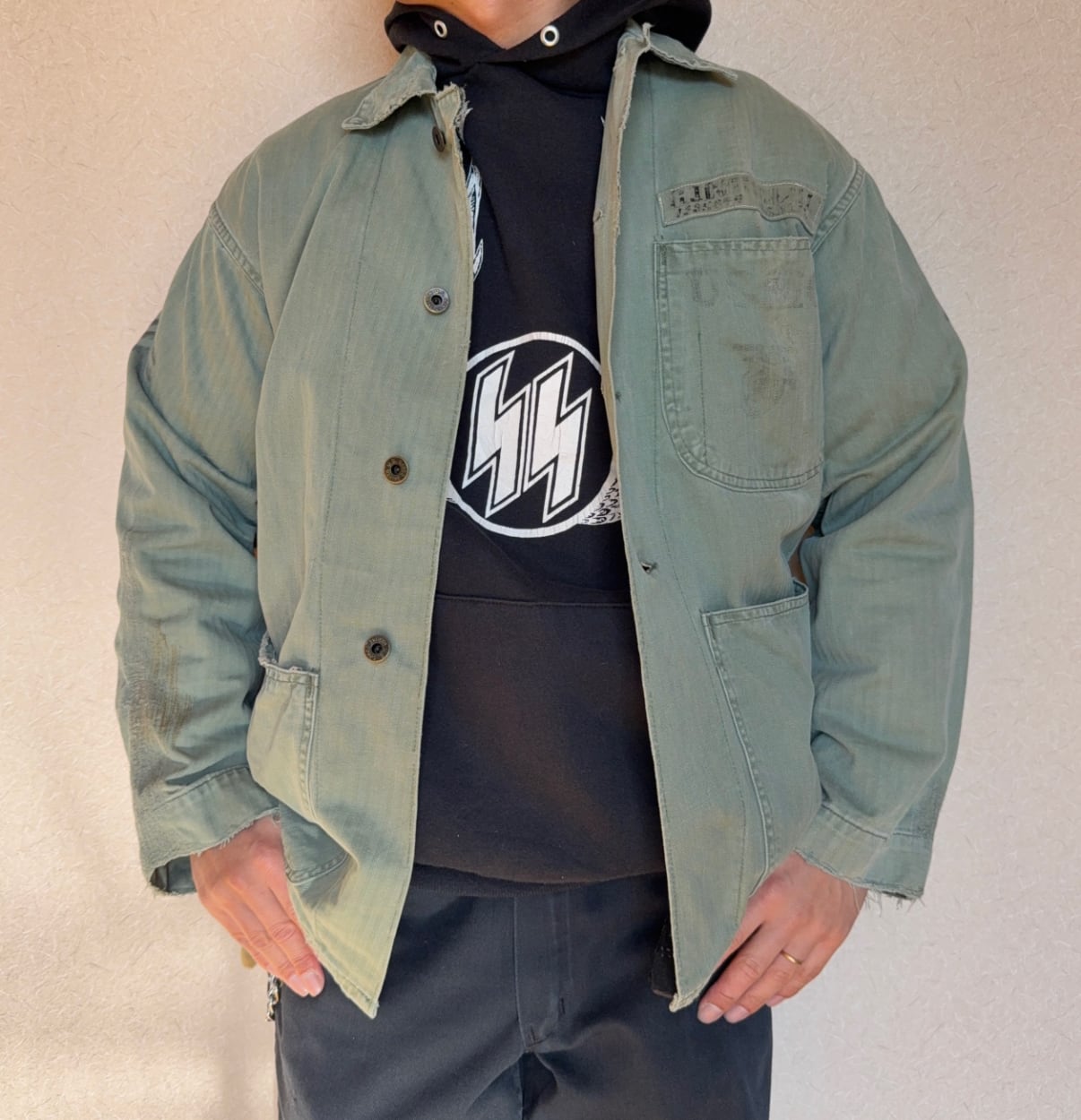 スウェットの上から来てますが、春先にサーマル着てスケートものやハーレー系のTシャツの上に着用してもとてもかっこいいと思います。
